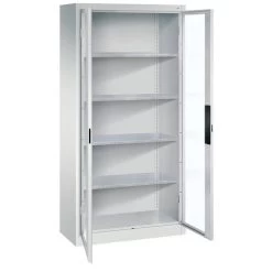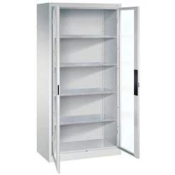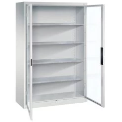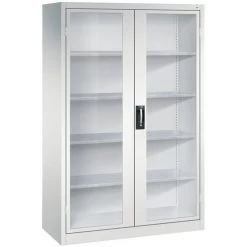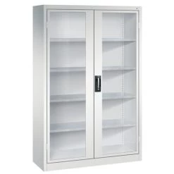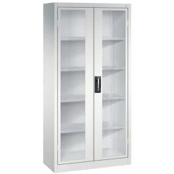 - scharnierend naar elkaar toe voor gemeenschappelijke sluiting,4 legborden van gegalvaniseerd staal met een hoog draagvermogen van 70 kg,1 ergonomische verzonken handgreep Ergo-Lock 4.0 voor optimale bedieningsveiligheid en slijtvast,3-bouts slot,met cilinderslot en 2 sleutels.