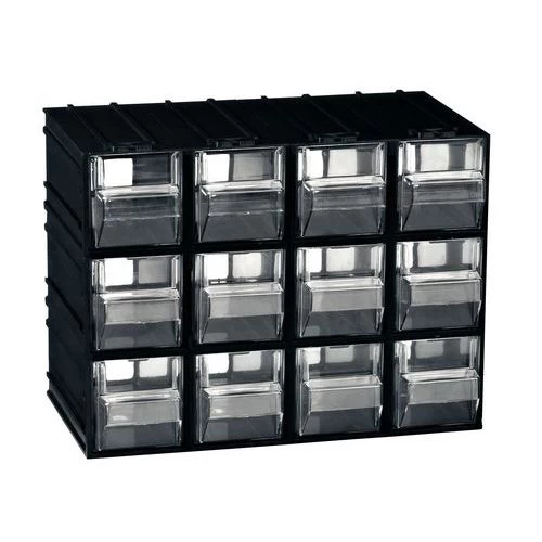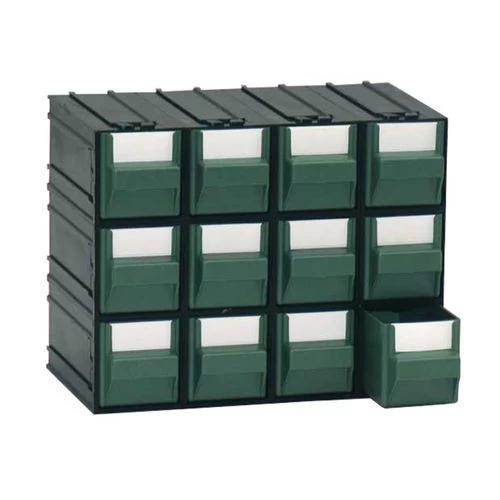 - Stevig ladeblok met 12 groene of doorzichtige laden voorzien van etikethouders.