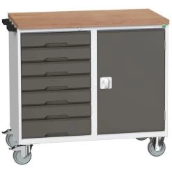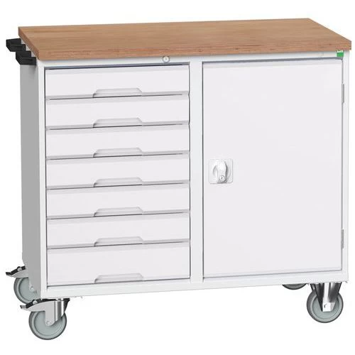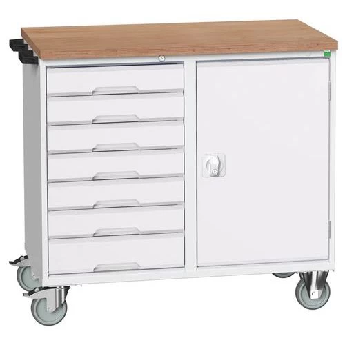 - Robuuste verrijdbare en vergrendelbare werkbank met stevig werkblad van multiplex.